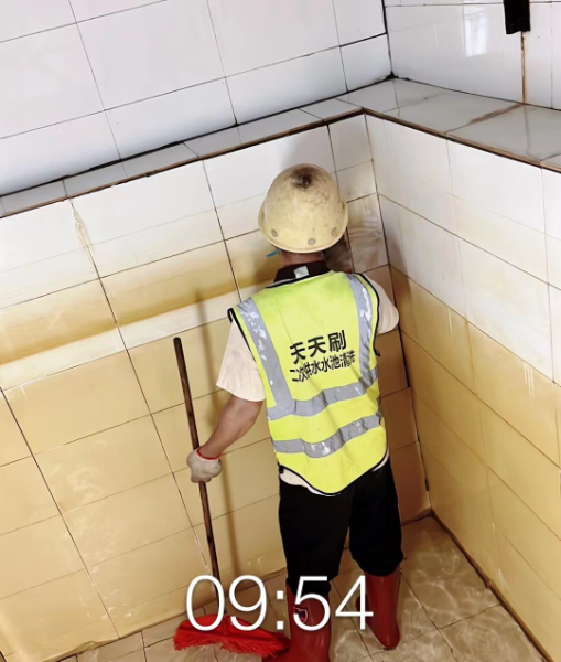 8、除杂物和清洗水池(箱)底部,依次反复刷洗四周墙壁,清洗人员清洗水池时,先用铁铲铲出池内泥砂及各种沉积物,然后刷洗完毕用清水整体冲洗一遍,排出污水。