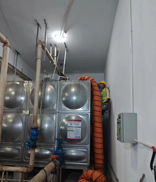 3、缺氧:有些水池长期封闭、无通气孔、空气流通极差,可在水箱底部水口处连接鼓风机吹风,约3小时通风时间。